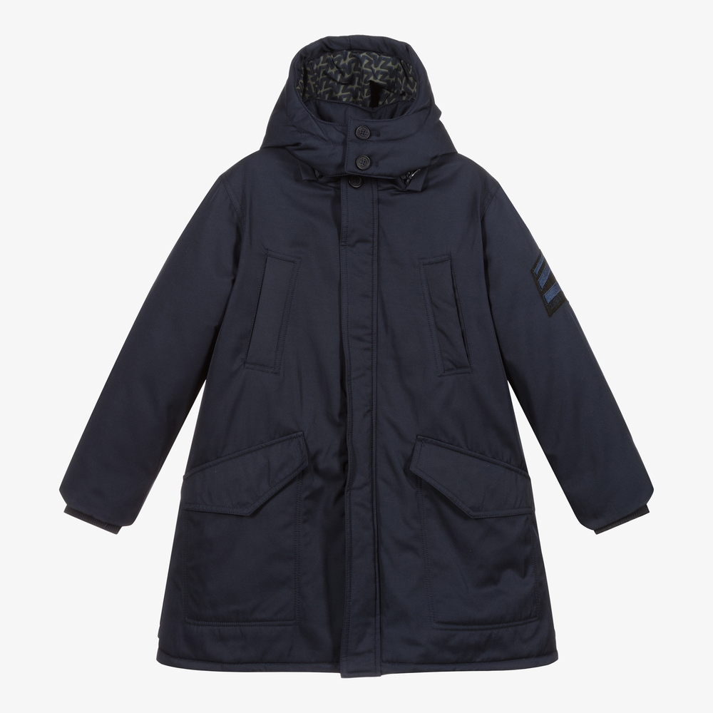 Navy blue coat for girls by Zadig & Voltaire Kids, made in a soft, smooth blend of cotton and polyester. Lightly padded, it has a khaki green, silky lining patterned with a blue and black monogram print. It has a detachable hood, fleece lined front pockets and a black and navy blue logo appliqué on one sleeve.