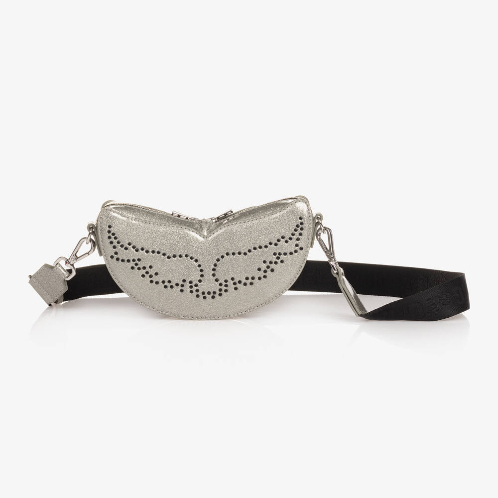 A stylish glittery silver shoulder bag for girls by luxury French brand Zadig&Voltaire, in shiny faux patent leather. The designer's signature winged motif is studded on the front with an embossed logo on the back for chic, contemporary look. It has a zip-up main compartment and a clip-on jacquard shoulder strap.