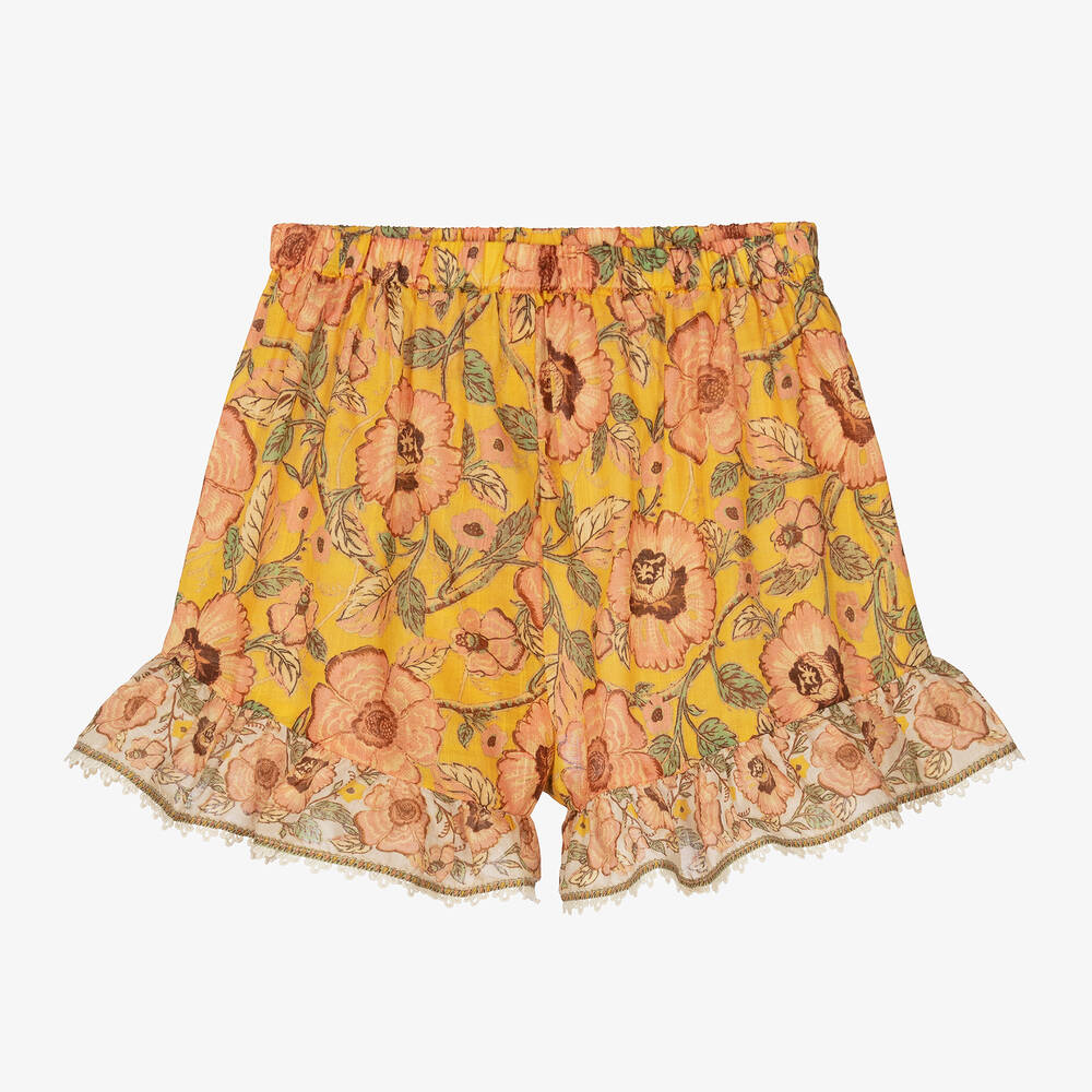 Dark yellow and pink shorts for girls by luxury Australian brand Zimmermann, woven from soft and lightweight cotton. Inspired by nature, they are patterned with lovely pink florals and green leaves. The ruffled hems are designed in a contrasting floral print and finished with a pretty crochet trim for a stylish, bohemian feel casual wear and resort look. They have a gently elasticated waist for little ones to pull on easily.