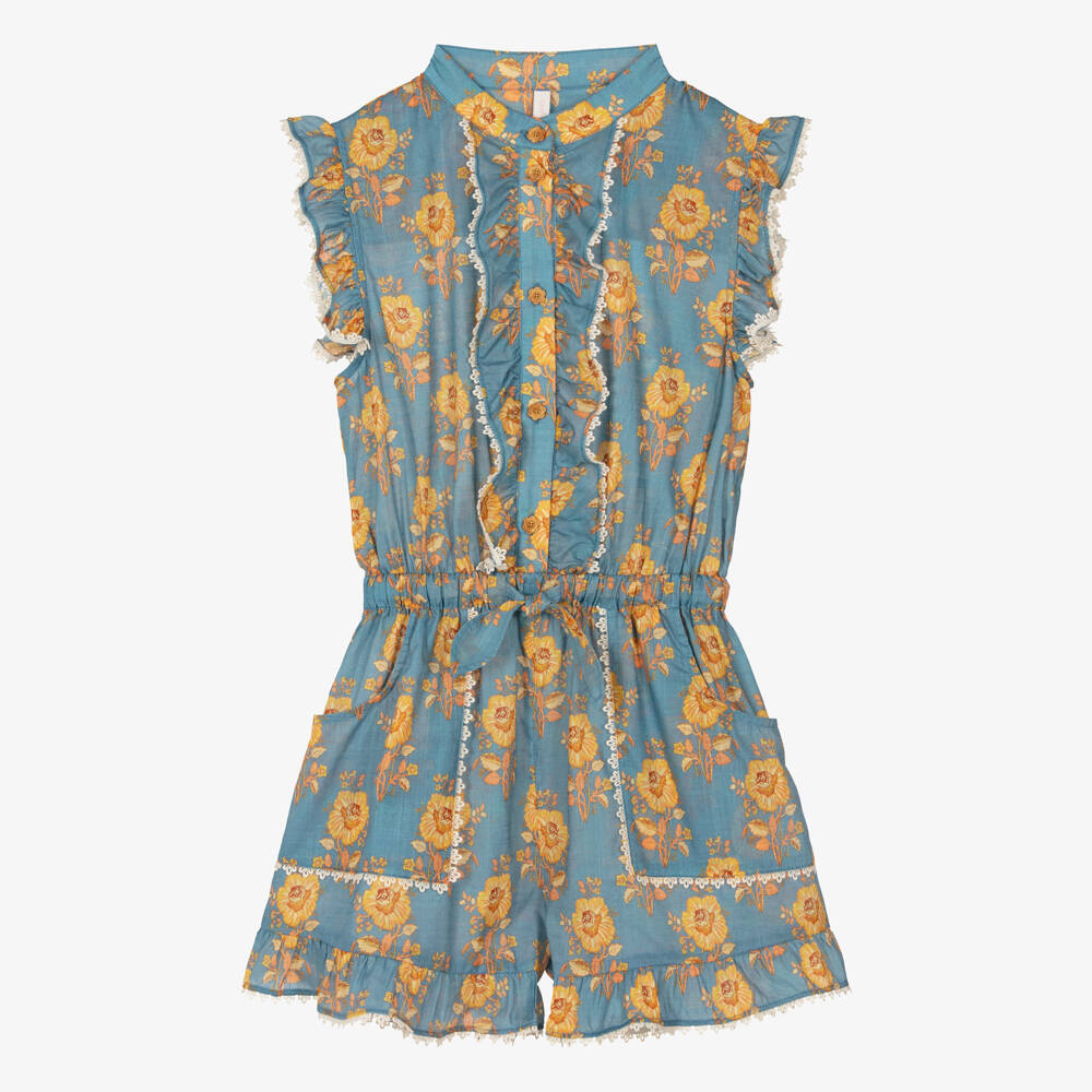 A charming blue cotton playsuit for teen girls, designed by Australian label Zimmermann. Luxurious for resortwear styling, it is patterned in a dark yellow floral design with ruffled trims and ivory crochet lace edging. Its flowy silhouette makes it the ideal companion for beach or casual wear, styled with a high neck and a wooden flower button-up placket. The waistline cinches in neatly using a bow drawstring and there are pockets underneath.