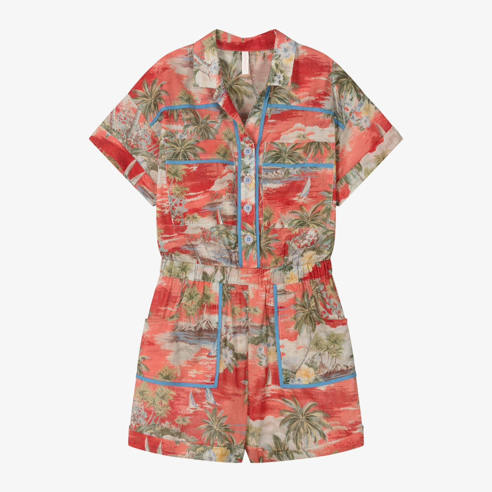 With a holiday-inspired, tropical island and yacht print, this cotton playsuit for teen girls is by luxury Australian brand Zimmermann. Ideal for warm days, it is made in beautifully cool, lightweight, red and green voile, with a revere collar, blue trims and four useful patch pockets. It fastens on the front with striped buttons and has a comfortable, elasticated waist.