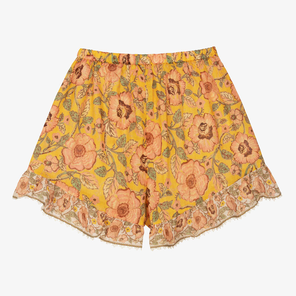From luxury Australian designer Zimmermann, these dark yellow and pink shorts are for teen girls. Combining a natural influence with vintage style, these lightweight cotton shorts are patterned with pink florals and green leaves. For a notable contrast, the floral hems are gently ruffled and trimmed with a delicate crochet edge. The fabric is slightly sheer and they have an elasticated waistband for optimal comfort.