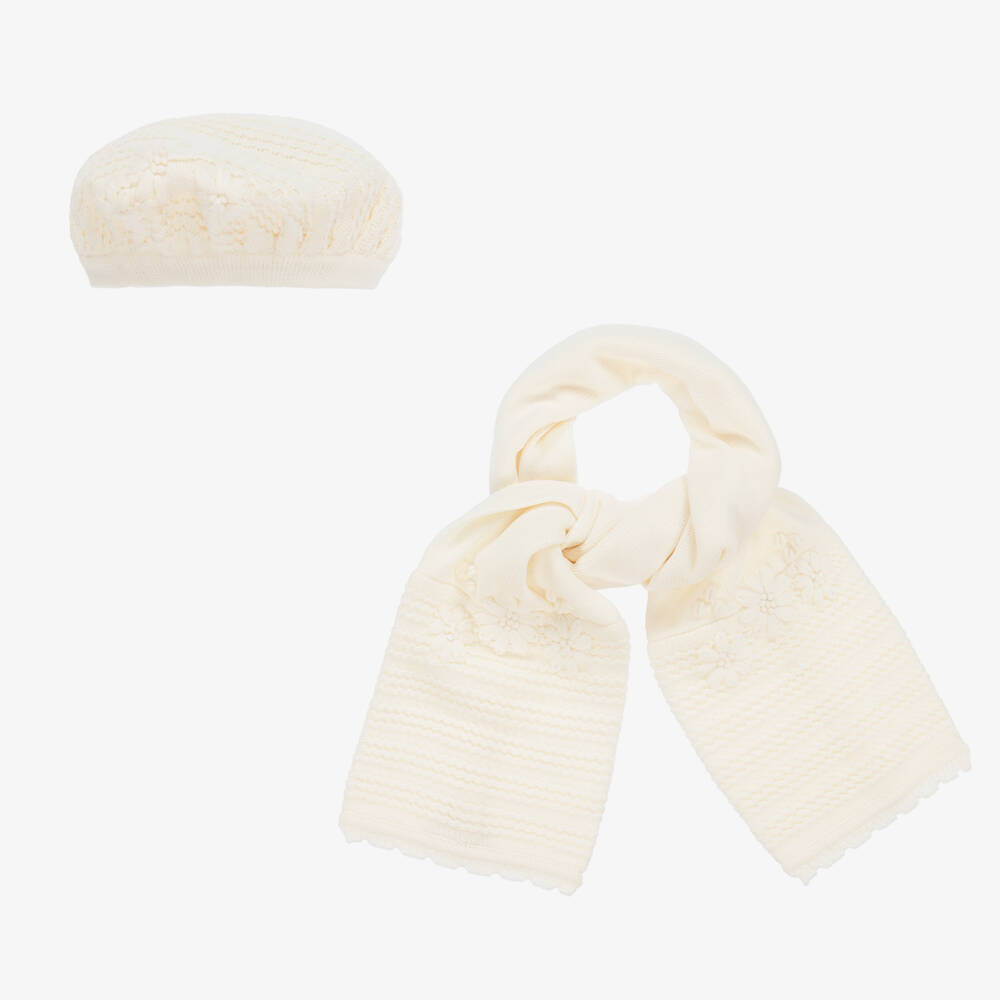 An ivory beret and scarf set for baby girls by British brand Sarah Louise, in a mid-weight ripple texture knit. This set has a beautifully hand-embroidered floral design in tonal ivory with scalloped edging on the scarf, keeping your little one cute and cosy. The beret has a lightweight knitted lining for extra warmth and is gently elasticated for a comfortable fit on the head.