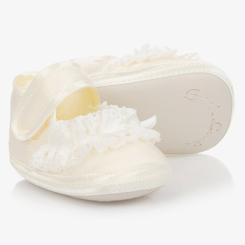 Ivory pre-walker shoes for baby girls by British brand Sarah Louise. Made in silky satin, they have a soft towelling lining and faux leather soles. There are pretty lace trims, with pearl-centred ribbon bows. The straps have an easy velcro fastening.