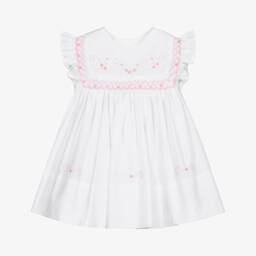 Traditionally styled white dress for baby girls by Sarah Louise, made in soft, lightweight cotton with sweet ruffle trims and scalloped edges. Fully lined for comfort, and trimmed with delicate hand-embroidered flowers, it has a pretty green and blue hand-smocked panel across the front. It fastens with buttons on the back and comes with a matching pair of knickers.