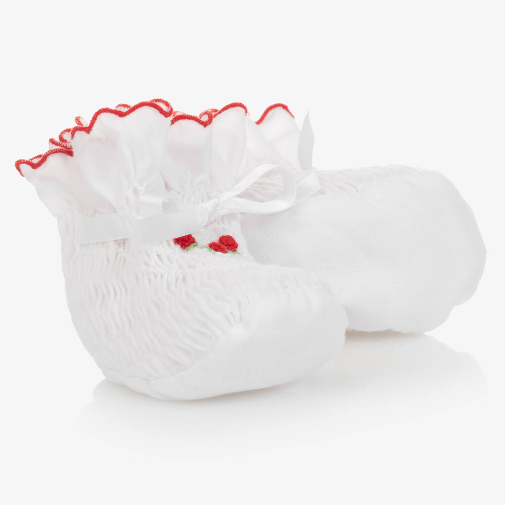 White booties for baby girls by British brand Sarah Louise, made in soft polycotton. They have hand-smocked detailing and delicate hand-embroidered red rosebuds. There are scalloped ruffles around the ankles, with satin ribbon ties to fasten.