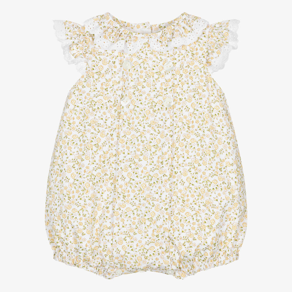 Ivory and yellow floral shortie for baby girls by British brand Sarah Louise, made in soft, lightweight cotton. Ideal for heritage styling, it has frilly trims with scalloped broderie anglaise edges and a panelled bodice with decorative pearlescent buttons. Fully lined in voile for comfort, there are coordinating pearlescent buttons that neatly fasten on the back and between the legs.