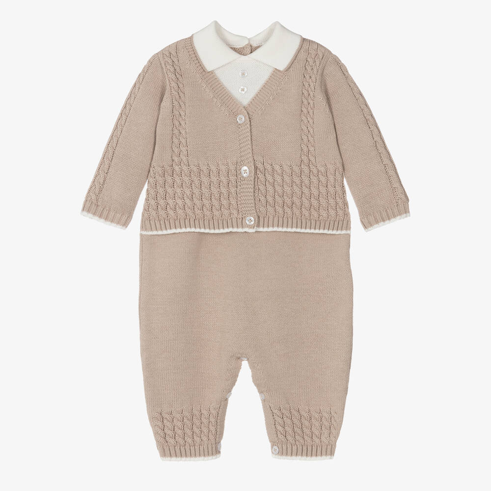 Adorable beige cotton knit romper for baby boys by Sarah Louise, with charming cable knit detailing. This babysuit has an attached cardigan for a classic layered look with the convenience and cosiness of an all-in-one. It fastens neatly with buttons on the back and between the legs.