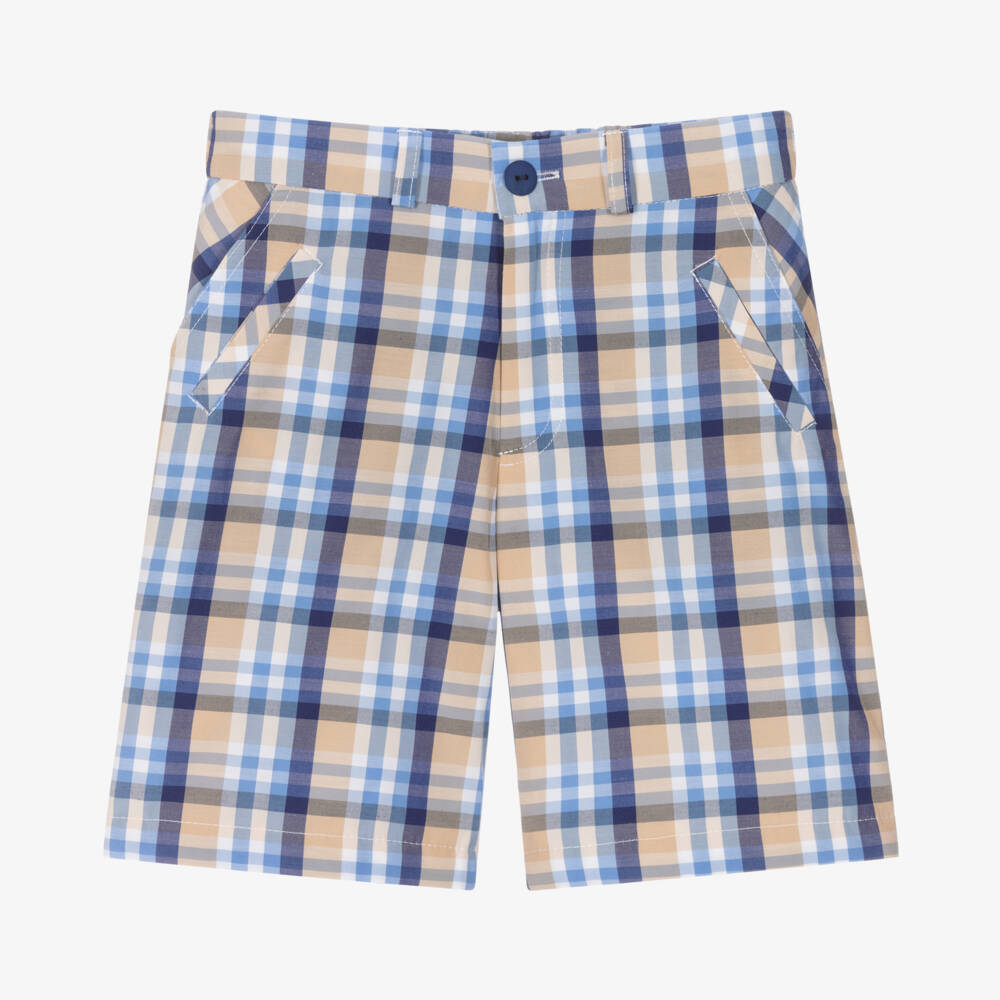 Boys blue and beige check shorts by Sarah Louise, made in a soft, lightweight cotton blend. These smart shorts have pockets on the front and back and are lined for comfort. They have a button and zip fastening, an elasticated back and an adjustable waist for a comfortable fit.