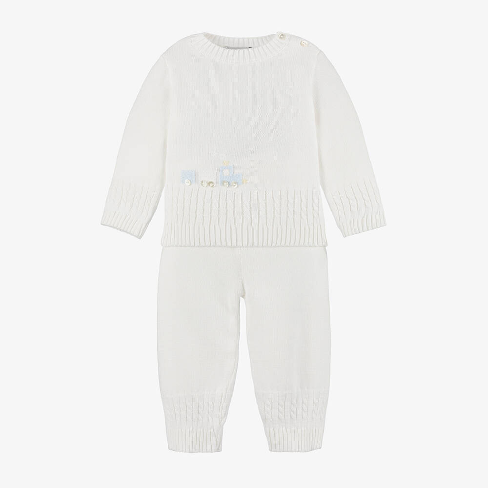 A lovely pale ivory trouser set for little boys by Sarah Louise, knitted in soft cotton. Charming cable knit detailing and a hand-embroidered train with decorative pearlescent wheels add a classic touch to this comfortable outfit. The long-sleeved jumper has button fastenings on one shoulder. The trousers have ribbed trims and a gently elasticated waistband.