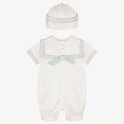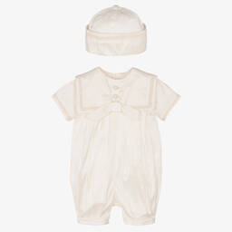 Special occasion ivory silk shortie for baby boys with a sailor collar by classic British designer Sarah Louise, with ivory trims and braiding. Pleated on the front and gathered on the back, it has a comfortable, loose, bubble style with decorative buttons on the bodice and partly elasticated cuffs for comfort. It fastens with buttons on the back and between the legs and comes with a matching hat.