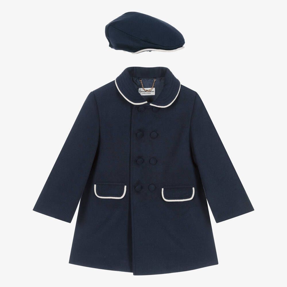 Navy blue coat and hat set for younger boys by Sarah Louise, a design excusive to Childrensalon. So charming and nostalgic, this traditional set is made from beautifully soft and cosy, felted fabric, with a smooth and silky lining. The double-breasted coat is designed with fabric-covered front buttons and a rounded collar and front pockets with ivory edges for that smart look. The classically-styled flat cap has an elasticated panel on the back to help keep it in place.