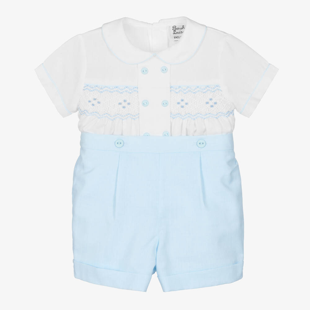 Little boys white and pale blue shorts set by Sarah Louise. The soft cotton blend shirt has lovely hand-smocking and embroidered detailsacross the front in blue. There are decorative front buttons and a sweet rounded collar, with button fastening on the back. The shirt attaches to the shorts with buttons on the front and back so that the two pieces stay neatly tucked in. The shorts
