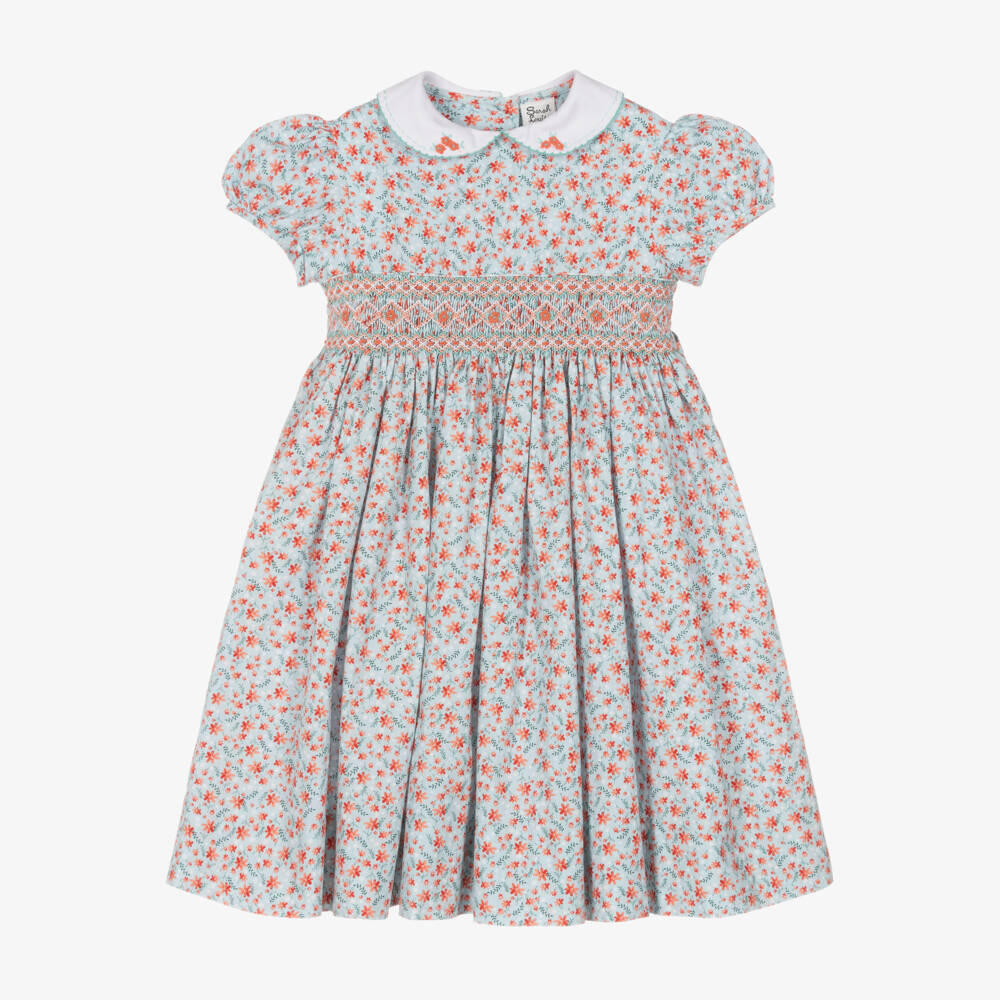 A lovely light blue dress for girls by British designer Sarah Louise, made in a soft cotton blend. It is designed in a pretty floral print with beautiful, hand-embroidered smocking across the bodice for a traditional look. Delicate orange and turquoise blue florals, along with intricate stitching can be seen on the white collar. Lined for comfort, it has pretty puffed sleeves and a fixed sash that ties into a bow on the back. The mother-of-pearl buttons on the back add a decorative finishing touch.