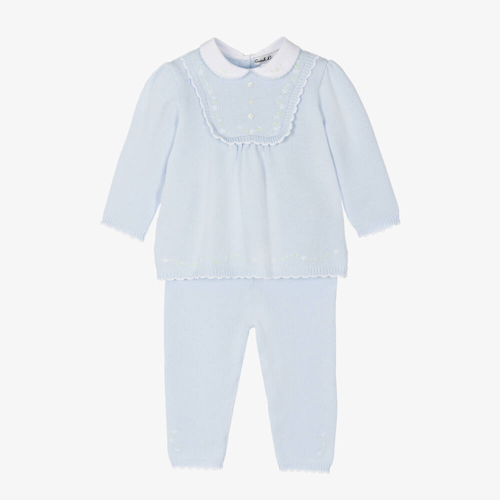 A lovely light blue trouser set for younger girls by Sarah Louise, with white scalloped trims. In a mid-weight cotton knit, the sweater has hand-embroidered details on the bodice with decorative buttons in the centre. Blue and green floral chains add delicate detailing to the hem and pearlescent buttons fasten on the back. The white Peter Pan collar is decorated with muted flowers and delicately finished with a blue picot trim. With matching needlework on the legs, the paired trousers have a stretchy waist to make dressing easier.