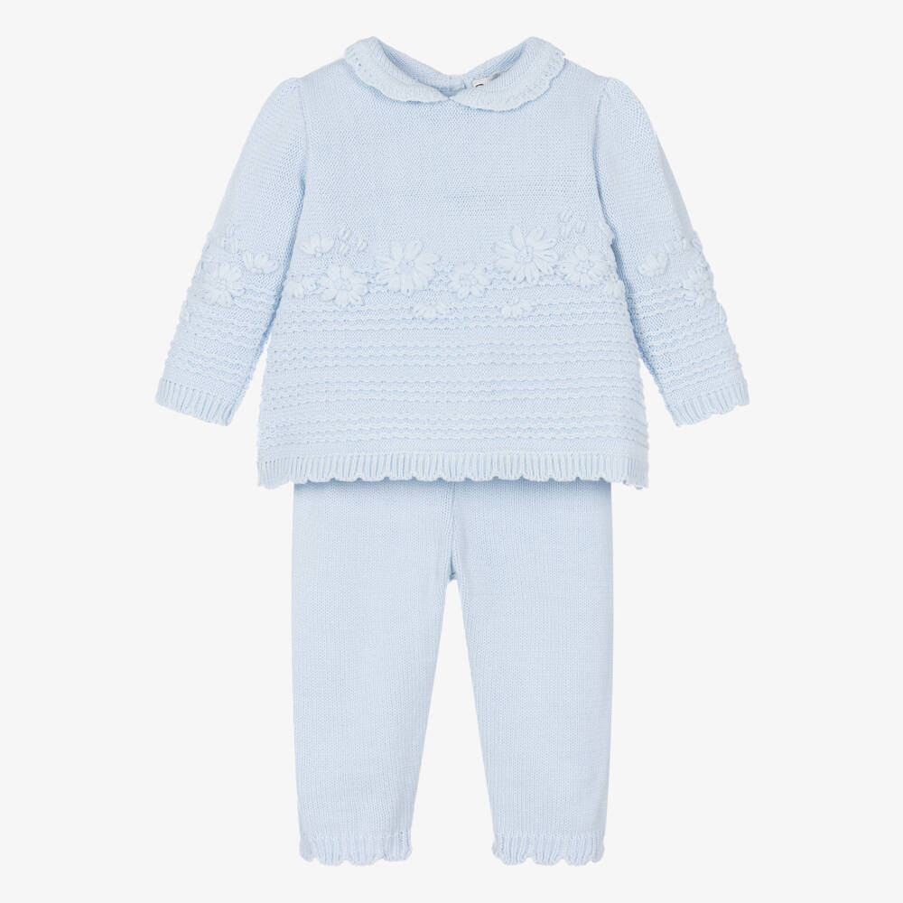 Little girls light blue trouser set by Sarah Louise, made in a soft, mid-weight knit and exclusive to Childrensalon. The top has a sweet Peter Pan collar, scalloped edges and delicate hand-embroidered flowers. It fastens with mother-of-pearl buttons on the back. A pair of matching trousers with a stretchy waist and scalloped hems complete the cosy set.