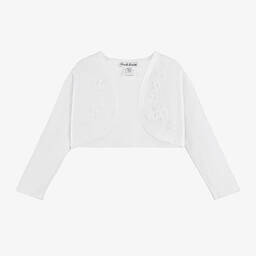 Sarah Louise girls ivory bolero cardigan, knitted in soft cotton with pretty embroidered flowers and sparkling pearl beads on the front.