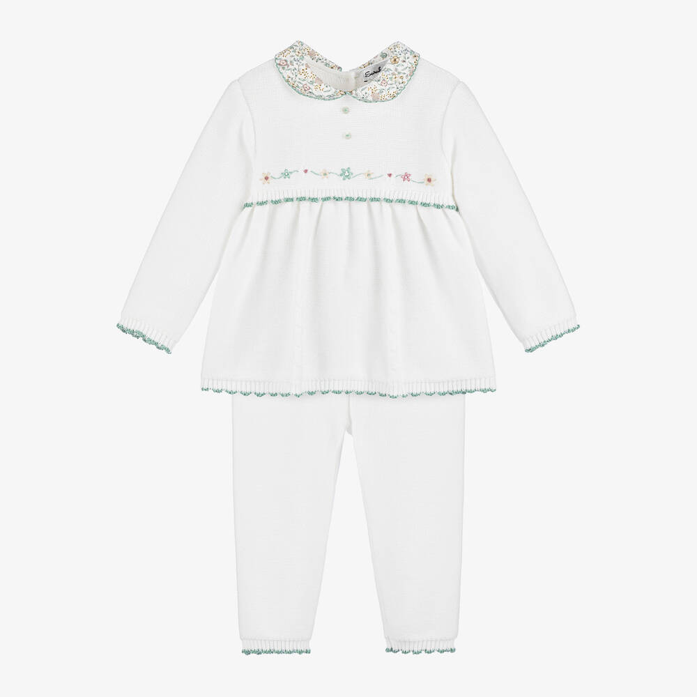 A beautiful ivory trouser set for younger girls by Sarah Louise, knitted in cotton for a soft and comfortable feel. With sage green scalloped trims, the long-sleeved top has a smart floral-patterned collar, decorative buttons and hand-embroidered flowers across the chest. It has a flared shape with cable detail on the front and button fastenings on the back. It pairs with matching knitted trousers that are gently elasticated on the waist to complete the charming set.