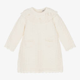 Younger girls pretty ivory dress by Sarah Louise, knitted in soft acrylic with a lovely all-over pattern. It has a knitted ruffle collar with little pearl decorations and a sweet bow detail. The collar, cuffs, hem and pockets have scalloped lace knit trim and there are button fastenings on the back.