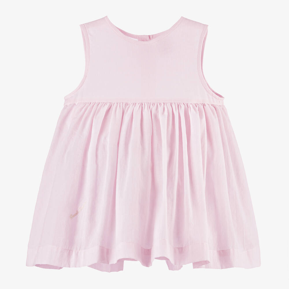 Little girls pale pink petticoat by Sarah Louise, softly woven in a cotton blend. Ideal for adding a fuller shape underneath dresses, this sleeveless style is plain pink and fastens with discreet buttons on the back. The voluminous skirt is formed by layers of structured tulle and plain woven fabric.