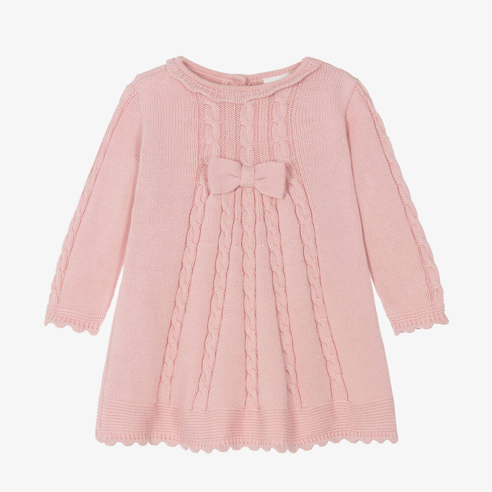 A lovely pink dress for younger girls by Sarah Louise, knitted in soft cotton with textured, cable knit detailing. Ideal for the cooler months, this long-sleeved dress has scalloped trims and a pretty bow on the front. Pearlescent buttons fasten neatly on the back.