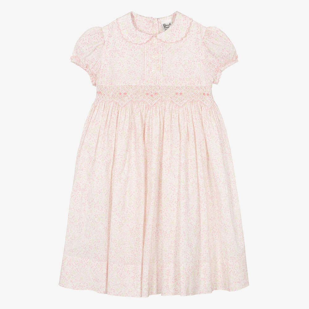 Girls Pink Floral Hand-Smocked Cotton Dress