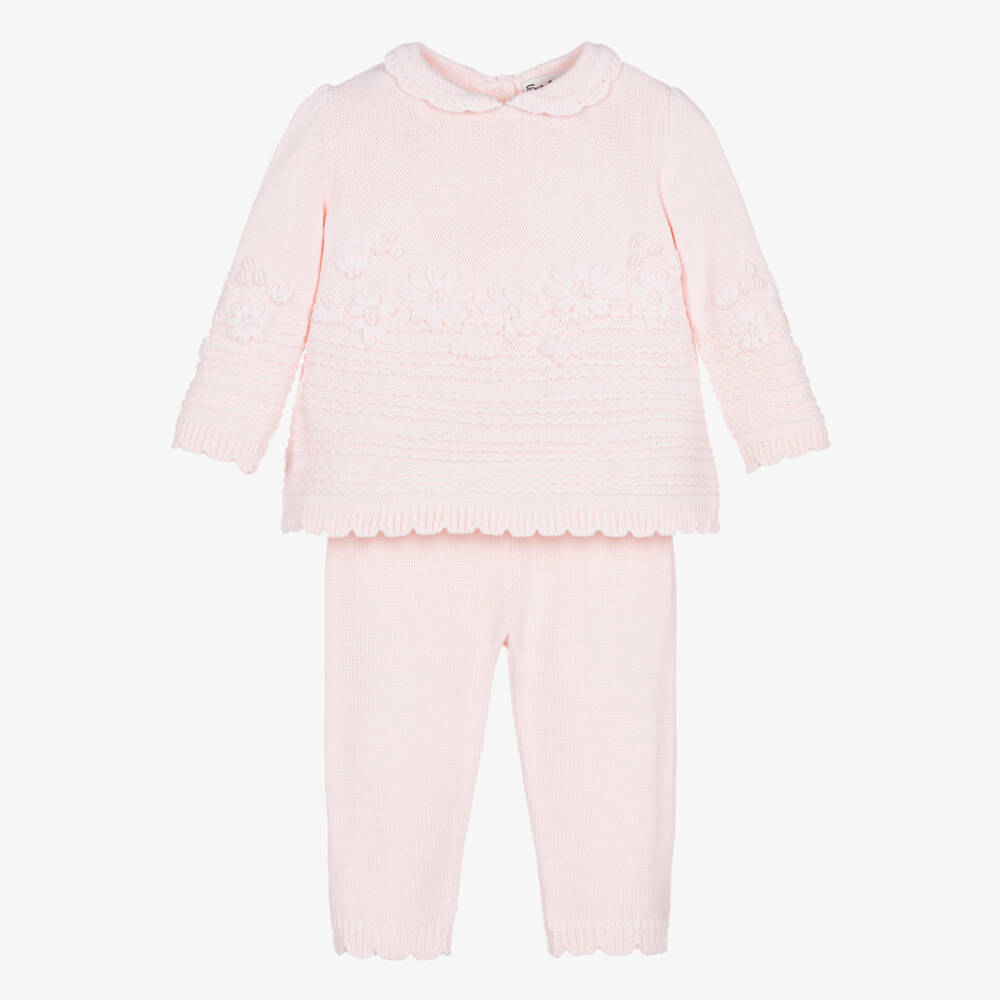 Little girls light pink trouser set by Sarah Louise, made in a soft, mid-weight knit. The top has a sweet Peter Pan collar, scalloped edges and delicate hand-embroidered flowers. It fastens with mother-of-pearl buttons on the back. A pair of matching trousers with a stretchy waist and scalloped hems complete the cosy set.