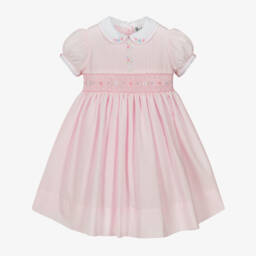 This traditional pink dress for girls by Sarah Louise, is ideal for a special occasion. Made in a lightweight cotton blend, it features delightful hand-smocking and delicate floral hand embroidery. It has pretty puffed, short sleeves and a contrast white Peter Pan collar. It fastens neatly with buttons on the back and a sash tie for a lovely finish.