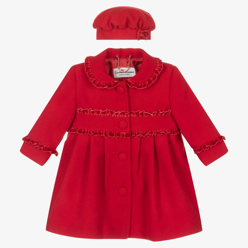 Red coat and hat set for little girls by Sarah Louise, made in a soft brushed viscose blend fabric. Traditionally styled, both pieces have a silky smooth lining for comfort. The coat has pretty velvet ruffle trims and fastens at the front with buttons and a concealed popper. This timeless look is completed with a matching hat that has an elasticated back and a decorative 3D bow at the front.