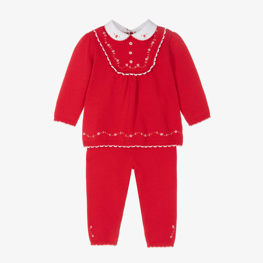 A lovely red trouser set for younger girls by Sarah Louise, with white scalloped trims. In a mid-weight cotton knit, the sweater has hand-embroidered details on the bodice with decorative buttons in the centre. White and green floral chains add delicate detailing to the hem and pearlescent buttons fasten on the back. The white Peter Pan collar is decorated with flowers and delicately finished with a red picot trim. With matching needlework on the legs, the paired trousers have a stretchy waist to make dressing easier.