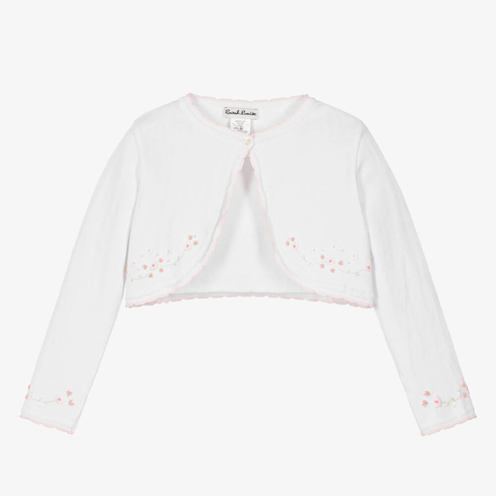 Adorable white bolero cardigan for girls by classic British brand Sarah Louise, knitted in soft cotton. It is delicately detailed with pink, scalloped trims, pretty, hand-embroidered flowers and pearl beads for a sweet finish. It fastens with a single button on the front.