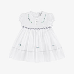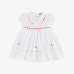 A pretty white cotton blend dress for little girls by Sarah Louise. Delicately hand-smocked, it has pink, green and red floral embroidery with small buttons on the fitted bodice. There are little pintucks on the front and around the hem and sweet puffed sleeves. The dress is lined in soft cotton for comfort and fastens on the back with buttons. Larger sizes have a sash tie on the back to create a bow.