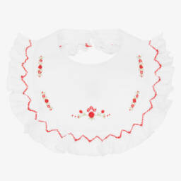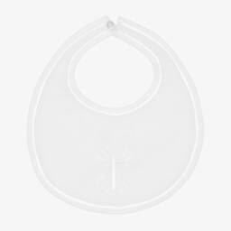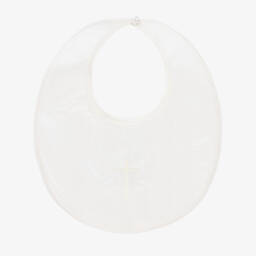 An ivory baby bib by Sarah Louise, made in luxuriously soft raw silk. Lined in silky satin, it has a pretty lace trim and pearl bead decoration. It fastens on the back with a pearl button.