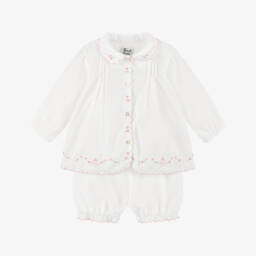 A pink shorts set for little girls from Sarah Louise, made in soft cotton blend. The blouse has sweet pink scalloped edges and hand-embroidered pink flowers. It fastens with mother-of-pearl buttons on the front and has front pleats. The matching bloomer shorts are gently elasticated for comfortable wear.