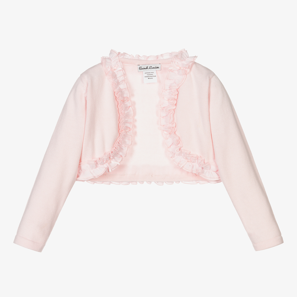 Girls pretty pale pink bolero cardigan by Sarah Louise, knitted in soft cotton with pretty ruffled trim, tiny ribbon bows and beads.