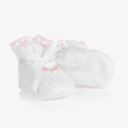 Baby girls pale pink booties by Sarah Louise. Made in soft cotton, they have hand-smocked detailing with delicate hand-embroidered pink rosebuds. They have ruffles around the ankles and fasten with ribbon ties.