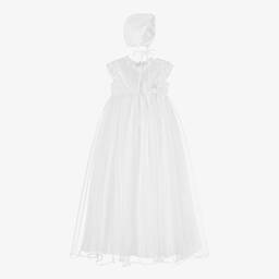 Baby girls beautiful white ceremony gown and bonnet set by Sarah Louise. Made in organza with layers of tulle for a lovely shape, it has exquisite hand-embroidered lace trims with pearl beads and sequins. The satin sash finish with a pretty bow on the back.