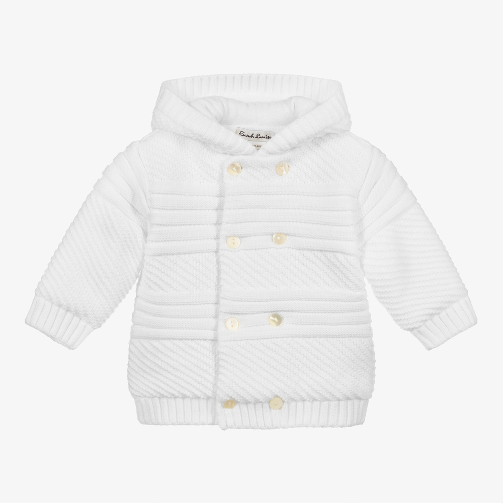 Younger boys and girls white hooded pram coat by Sarah Louise. Lightly padded and cosy, it is made with soft, midweight knitted acrylic. It fastens with double-breasted pearlescent buttons on the front.