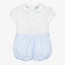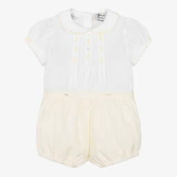 Younger girls yellow and white traditional style shorts set by Sarah Louise. Made in soft polycotton, with pleating, pretty scalloped trims and blue and green hand-embroidery. The top cleverly buttons onto the lined shorts for a neatly tucked in look.