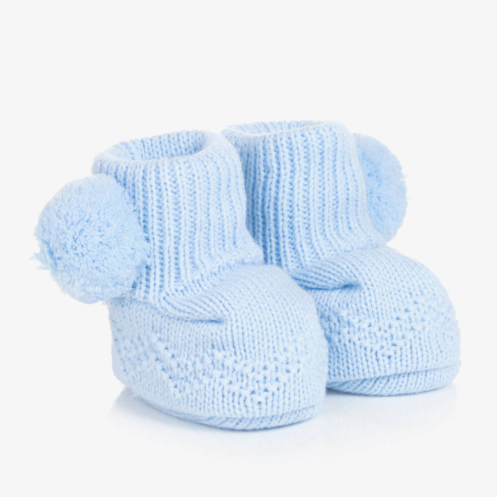 Pale blue knitted booties for baby boys and girls by Sätila of Sweden. Lined with soft cotton jersey for added comfort and warmth, these sweet booties have pom-poms on the side for an adorable finish.