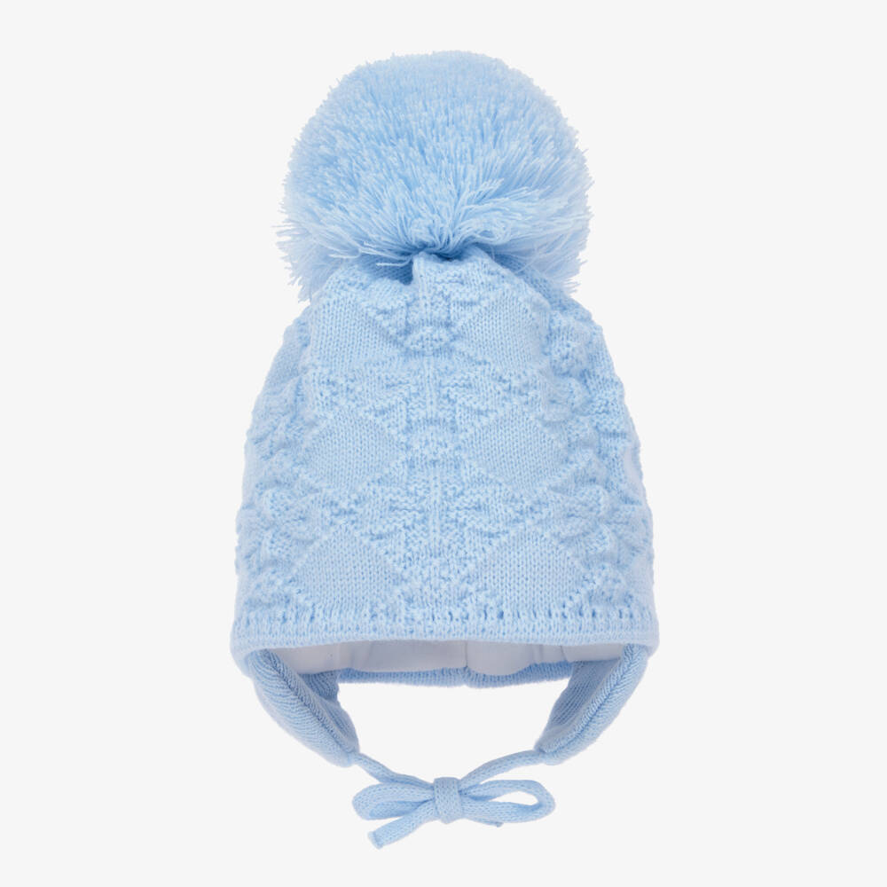 Sweet and adorable, this pale blue winter hat for little boys and girls is by Sätila of Sweden. Lined in soft cotton jersey, it is knitted in a raised diamond pattern and has a giant pom-pom on the top. For extra warmth and comfort, it has little ear flaps and ties that fasten under the chin.