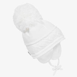 A charming white winter hat for little boys and girls by Sätila of Sweden. Made from a stretchy knit with patterned trim, it has a giant pom-pom on top and sweet ear flaps with ties that secure under the chin. It is partially lined in soft knitted cotton for extra comfort and cosiness.