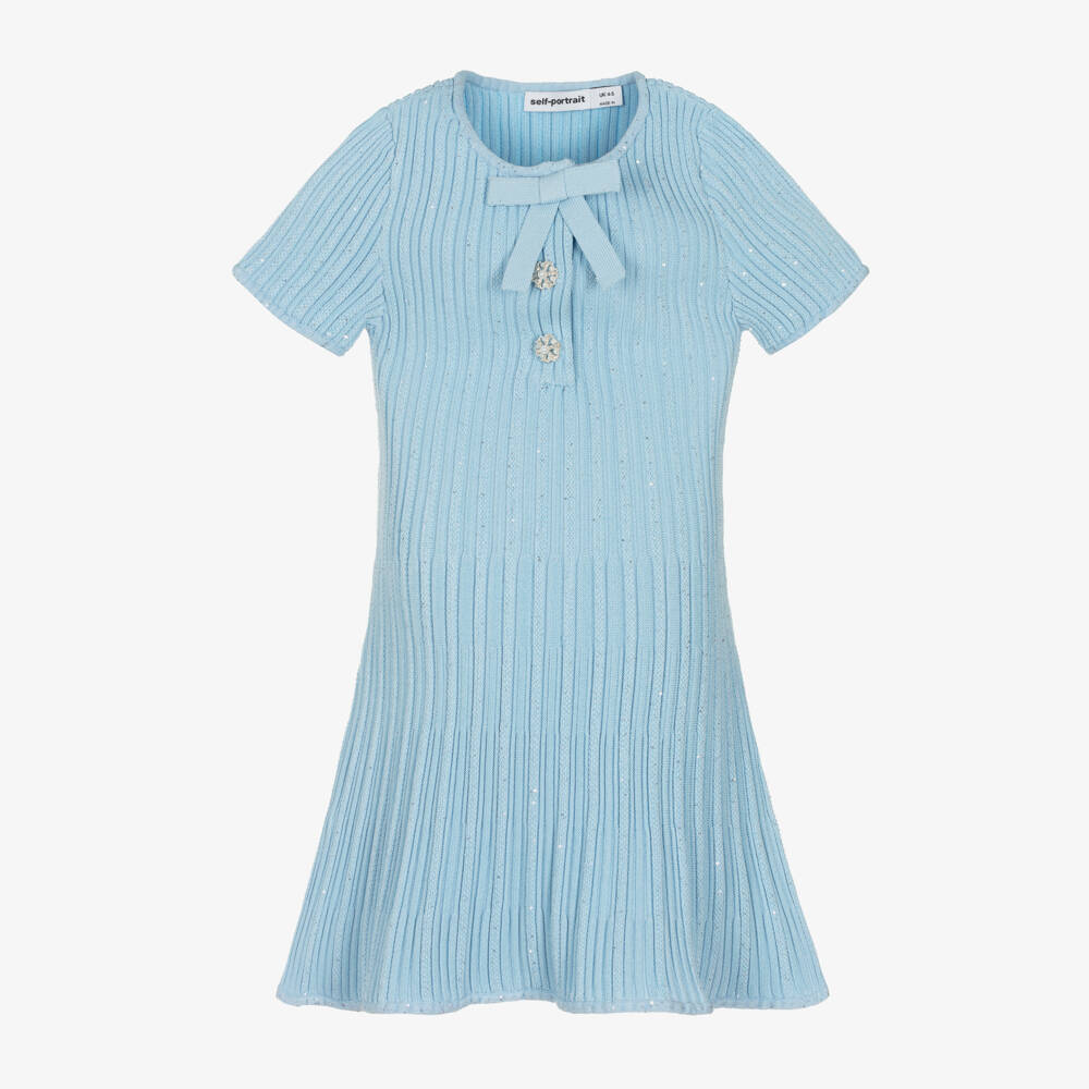 A beautiful style from Self-Portrait, this gorgeous blue dress for girls is made in a finely knitted viscose blend. So elegant, it features a decorative bow and sparkling diamanté on the popper-fastening bodice. This short-sleeved dress is designed in an elegant silhouette that flares towards the hem for extra flounce. Tiny sequins within the ribbed-knit fabric add a touch of sparkle.