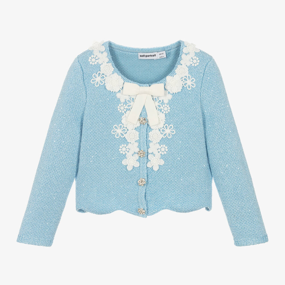 Stunning blue cardigan for girls by Self-Portrait, beautifully knitted with sequins for a subtle shimmer. Lovely for a special occasion look, it is trimmed with delicate white floral lace on the neckline and front, together with a knitted white bow detail. The cardigan fastens easily with poppers beneath decorative, sparkly diamanté flowers. Made in a soft cotton and wool blend, this classic long-sleeved style has a lovely scalloped hem detail that sits neatly on the waist.