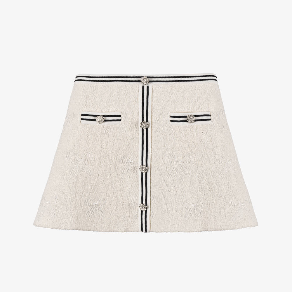 Lovely ivory skirt for girls by Self-Portrait, knitted in a soft cotton blend with a pretty jacquard bow design. Classically styled, with a simple A-line shape this stylish skirt has elasticated black and white striped trims and front pockets. There are decorative diamanté daisy buttons adding a touch of sparkle and an elasticated waist for comfortable wear.