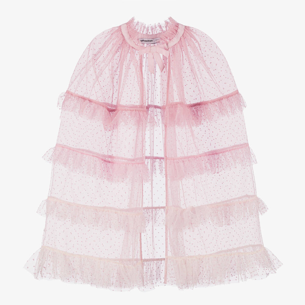 A beautiful pink cape for girls by Self-Portrait, made in fine tulle for a lightweight feel. A great addition to any special occasion outfit, this lovely piece has an ombré finish, gradually changing from pink to white at the hem. Delicate pink polka dots can be seen throughout the fabric and pretty ruffles add texture all around. There is a pink grosgrain trim on the neckline with a decorative bow and a popper fastening.