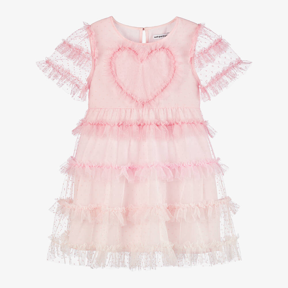 Light pink special occasion dress for girls by Self-Portrait, beautifully characterised by ruffles. Made in fine tulle with delicate pink polka dots, this lovely style has a round neckline, sheer short sleeves, and an oversized heart motif on the front. The dress has a silky smooth lining and fastens with both a keyhole button and a concealed zip on the back.