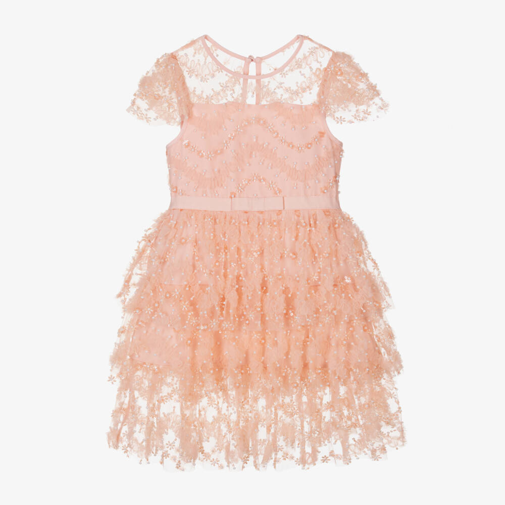 Absolutely divine, this pale pink special occasion dress for girls is by Self-Portrait. Romantic and feminine, it is made from lightweight tulle decorated with beads, faux pearls, and sequins for extra glamour. The sheer neckline and layered short sleeves add a touch of whimsy, and the tiered skirt enhances the enchanting look. Complete with a grosgrain ribbon bow trim around the waist, it has a concealed zip and keyhole button fastening on the back and soft partial lining for comfort.