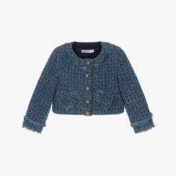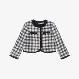 Mini-me pink and white jacket for girls by Self-Portrait, made from soft tweed. Lovely for a smarter occasion, this classic style has chest pockets and a white woven collar, with a beautifully embroidered organza overlay. A black grosgrain ribbon bow on the neckline adds an elegant finishing touch. Fully lined in silky satin for a comfortable feel, the jacket fastens with poppers on the front, set below decorative pearl bead buttons.