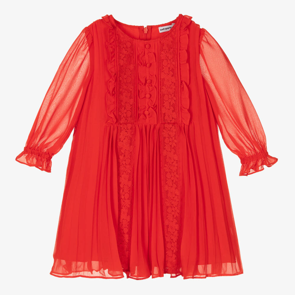 In a striking shade of red, this chic chiffon dress is designed for girls by London based brand Self-Portrait. Fastening with a concealed zip on the back for minimalist dressing, it has stunning floral lace panels on the front with stylish puffed sleeves.